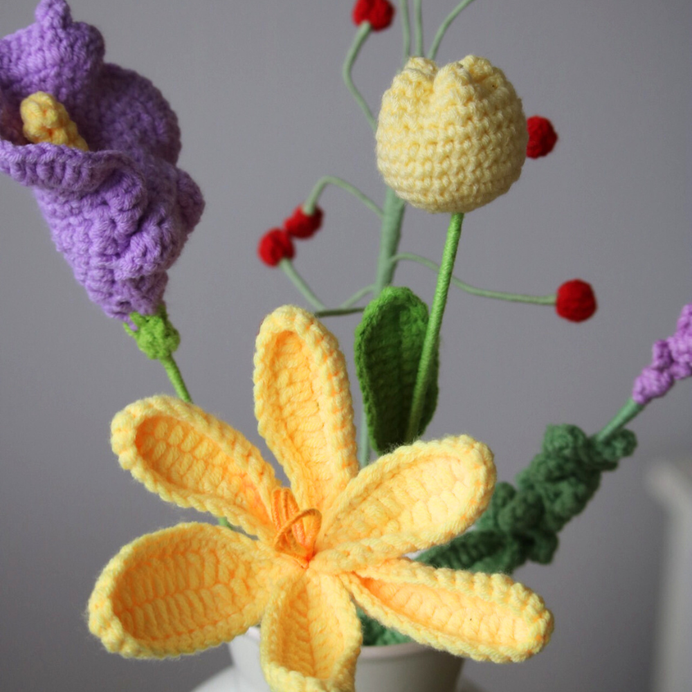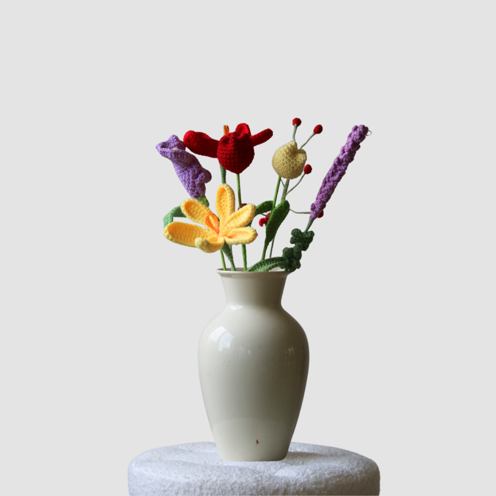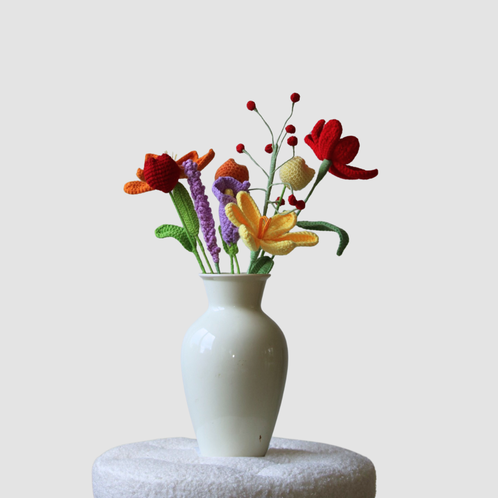 Boeket Betty is een kleurrijk boeket dat vrolijkheid en warmte in elke ruimte brengt. De gehaakte bloemen in tinten geel, rood, paars en oranje vormen samen een prachtig symbool van zorg, liefde en verwennerij. Geen verwelking, alleen blijvende betekenis en dankbaarheid — een boeket dat het hart raakt.