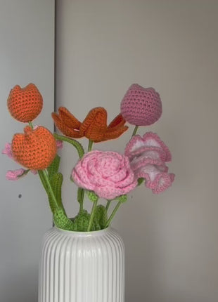 Het gehaakte wollen boeket Valeria is samengesteld om iedereen op te vrolijken. De combinatie van de kleuren oranje en roze geeft energie en vrolijkt iedereen op.