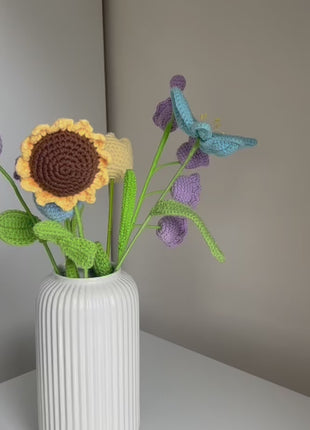 Het gehaakte wollen Boeket Mila is zorgvuldig samengesteld. De kalme blauwtinten en zachte pastels stralen sereniteit uit en kunnen helpen om een rustgevende sfeer te creëren in jouw woonkamer, keuken of slaapkamer. Het gehaakte wollen boeket Mila bestaat uit 6 bloemen met 3 soorten kleuren.