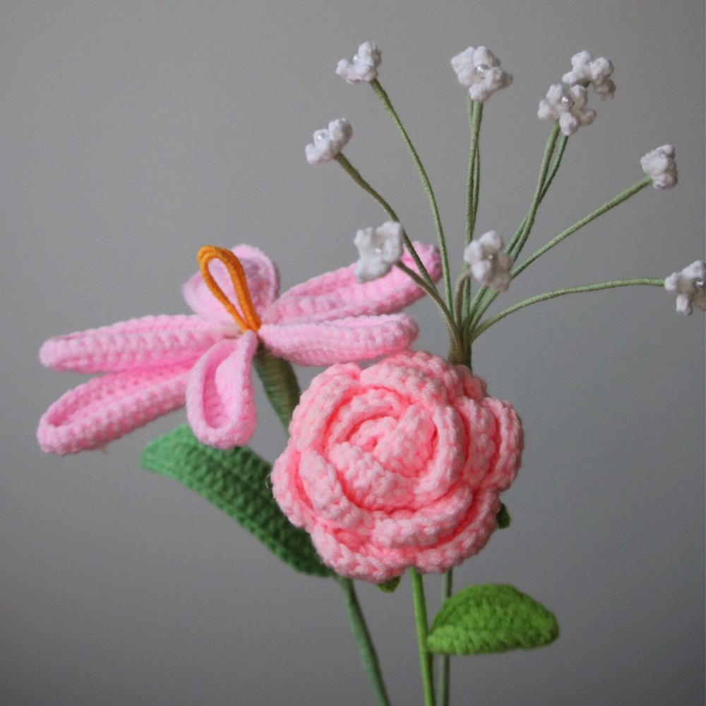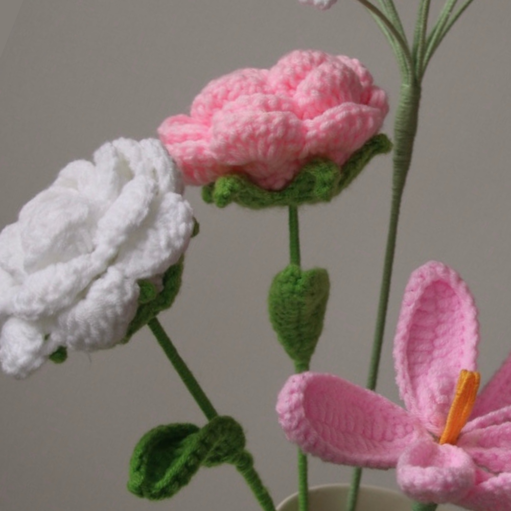 Groot (9):  Roze roos, Witte roos, Roze hibiscus, 2x Witte vergeet-me-nietje, Roze vergeet-me-nietje, Witte tulp, Roze anjer, Roze Lelie