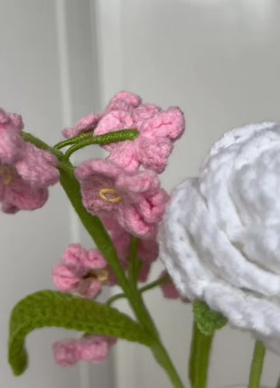 Het Boeket Victoria is een stijlvol en sprookjesachtig gehaakt boeket dat bestaat uit 3 witte rozen en 4 Vergeet-me-nietjes. De zachte kleuren en verfijnde vormen maken dit het droomboeket voor wie houdt van romantiek, rust en elegantie.