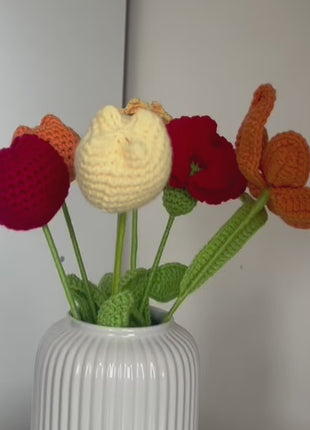 Het gehaakte wollen boeket Sunny is samengesteld ter inspiratie van de zonsondergang, met warme, gouden en oranje tinten die de serene schoonheid van het avondlicht weerspiegelen. Het boeket brengt een rustige, zonnige sfeer in huis en is perfect voor wie houdt van een natuurlijke en verfijnde uitstraling