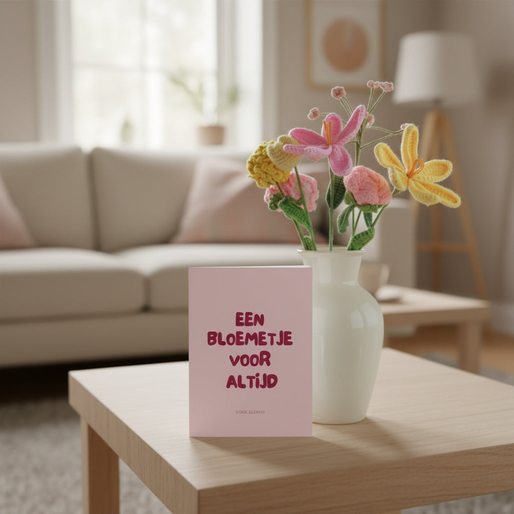 Ook zorgen wij er dan voor dat er géén promotiemateriaal mee wordt gestuurd. Alleen de mooie bloemverpakking van Woolbloom, zodat het écht als een cadeautje voelt. 🌸